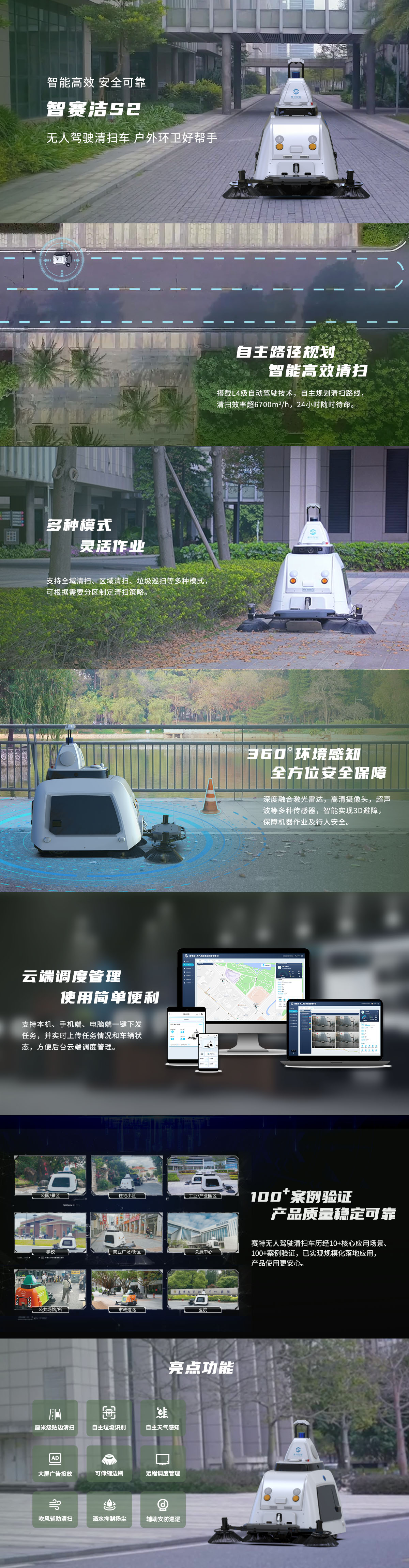 無人駕駛清掃車S330具備區(qū)域自規(guī)劃清掃、零間隙貼邊清掃、全遍歷清掃等多種作業(yè)模式,結(jié)合自主充電、自主加水、自主倒垃圾等高度智能化功能